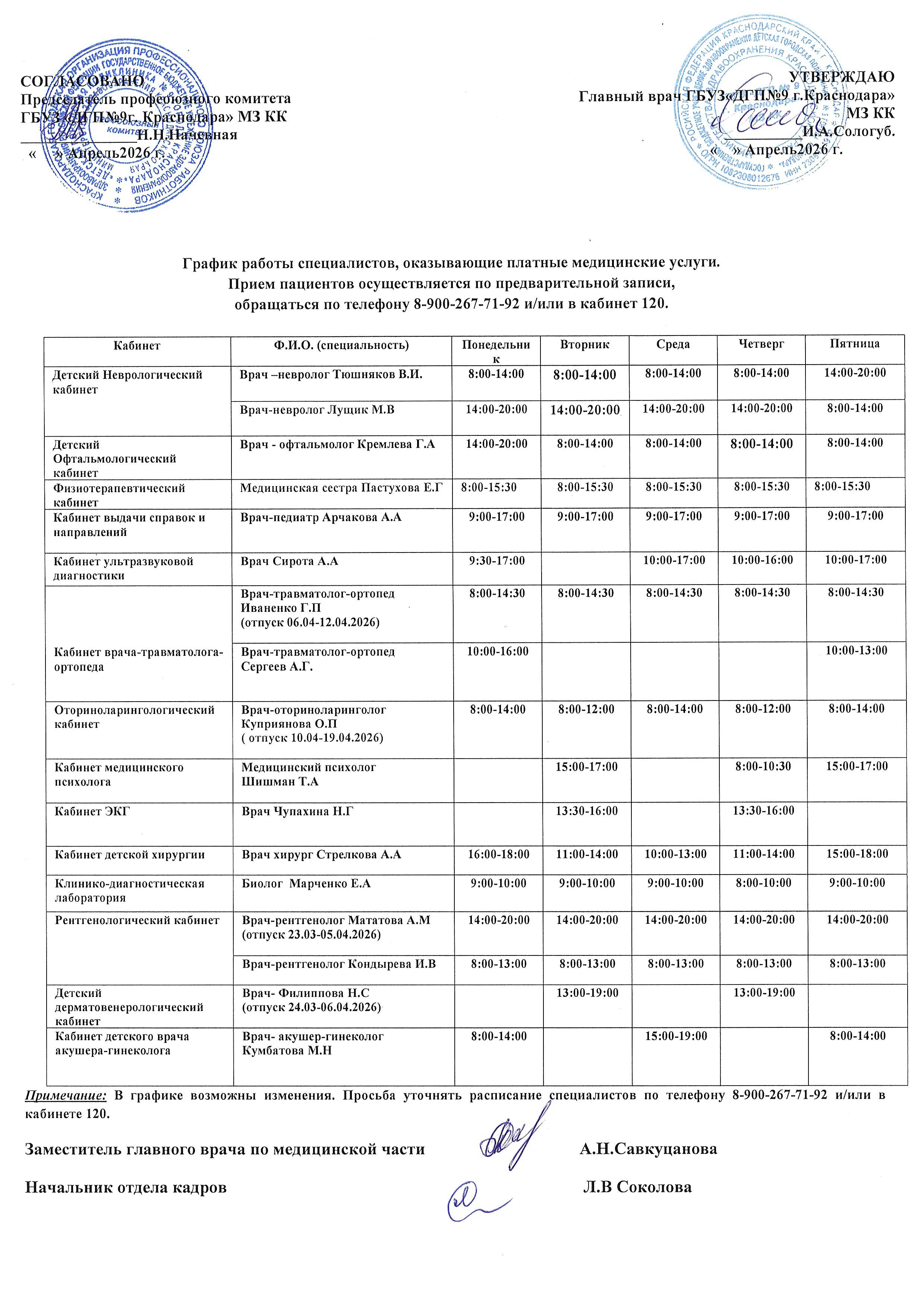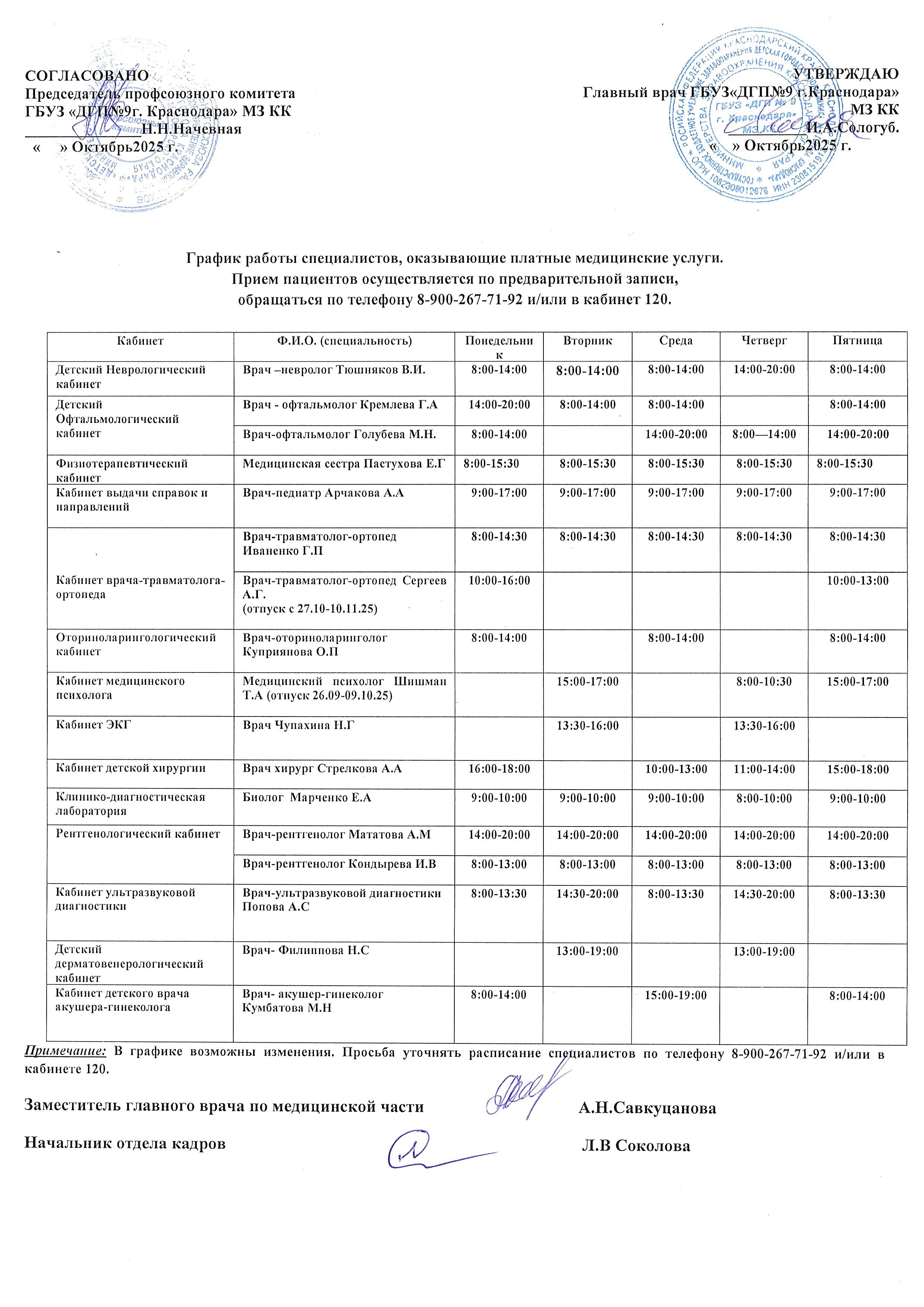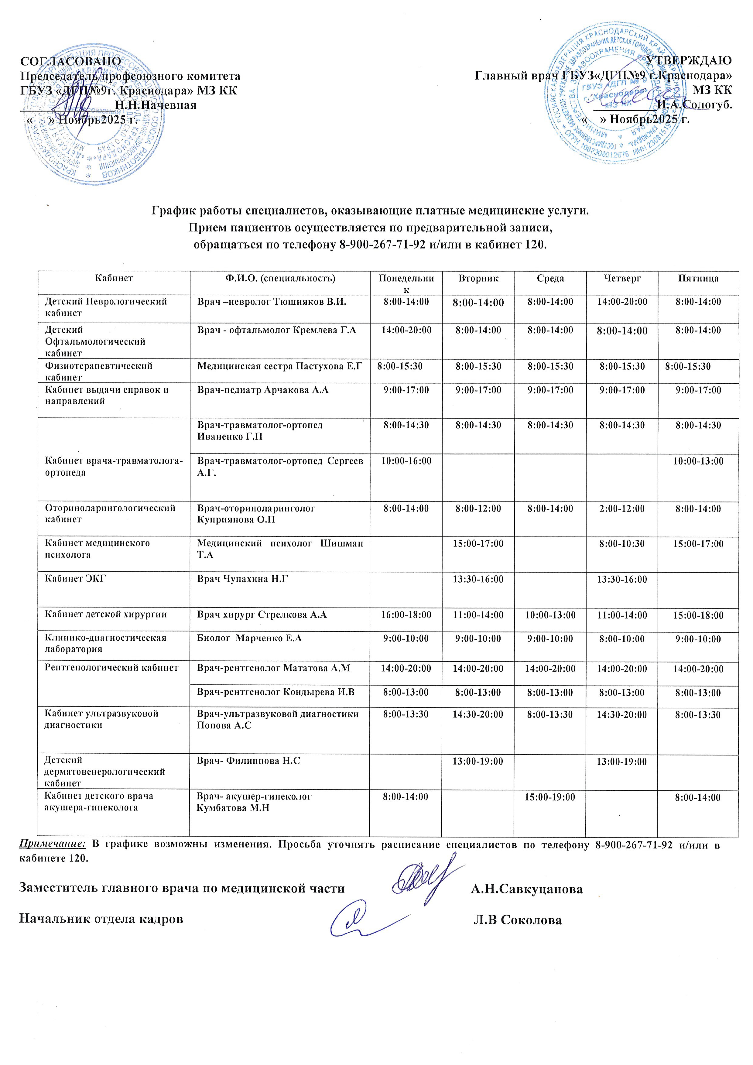 График работы медицинских работников участвующих в предоставлении платных медицинских услуг